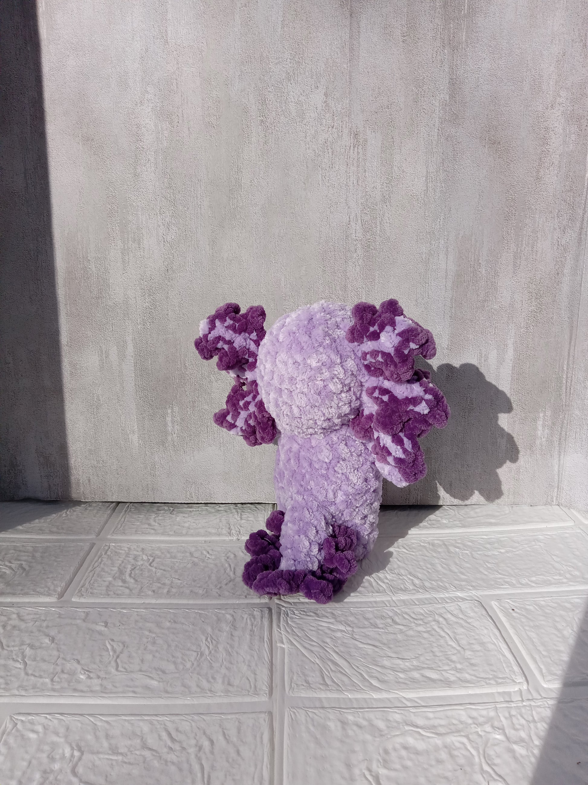 Meet your new aquatic buddy! Crafted from soft chenille yarn, this adorable axolotl plushie is perfectly sized for cuddling at 7 inches tall and 5.5 inches wide. Ideal for collectors, gift-givers, or anyone who loves these whimsical creatures. A handmade treasure that brings smiles and charm to any space.