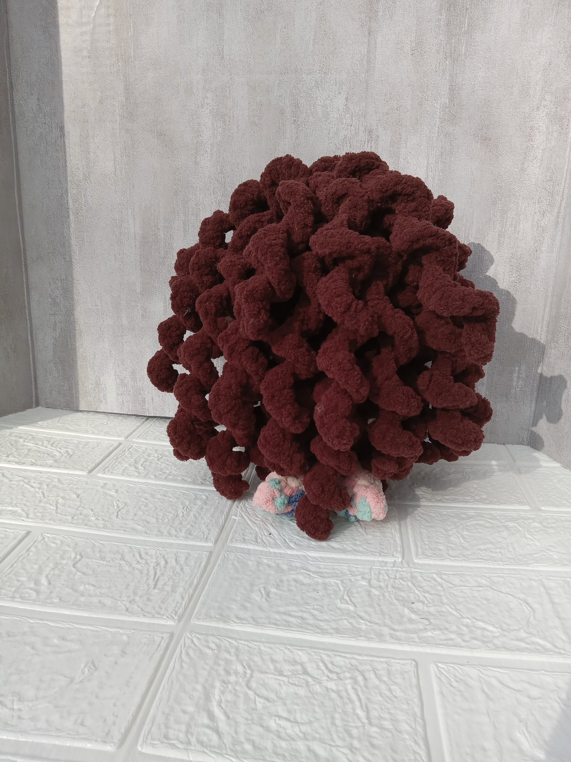 Crafted from premium blanket yarn, this mermaid plushie stands 13 inches in height and spans 8 inches across the arms. Distinctive handmade glitter eyes and voluminous curly hair create character and charm. A thoughtfully designed companion piece that showcases artisanal construction and attention to detail.