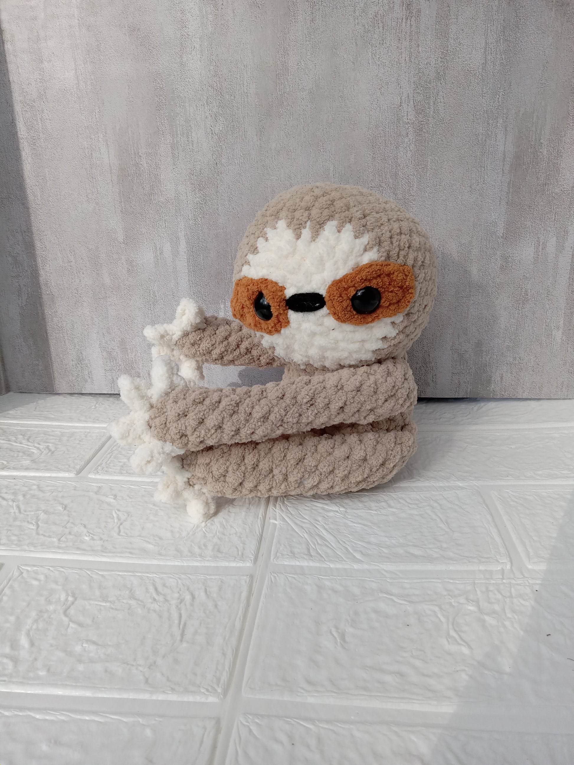 Crafted from premium blanket yarn, this sloth plushie measures 8 inches in height and 7 inches across, offering a perfectly proportioned companion. The soft, tactile construction showcases quality handmade artistry ideal for collectors and gift-givers alike.